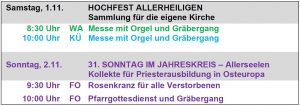 - Gräbersegnung: Am Nachmittag von Allerheiligen oder an Allerseelen findet auf den Friedhöfen oft eine feierliche Gräbersegnung statt, bei der ein Priester oder Diakon die Ruhestätten segnet.