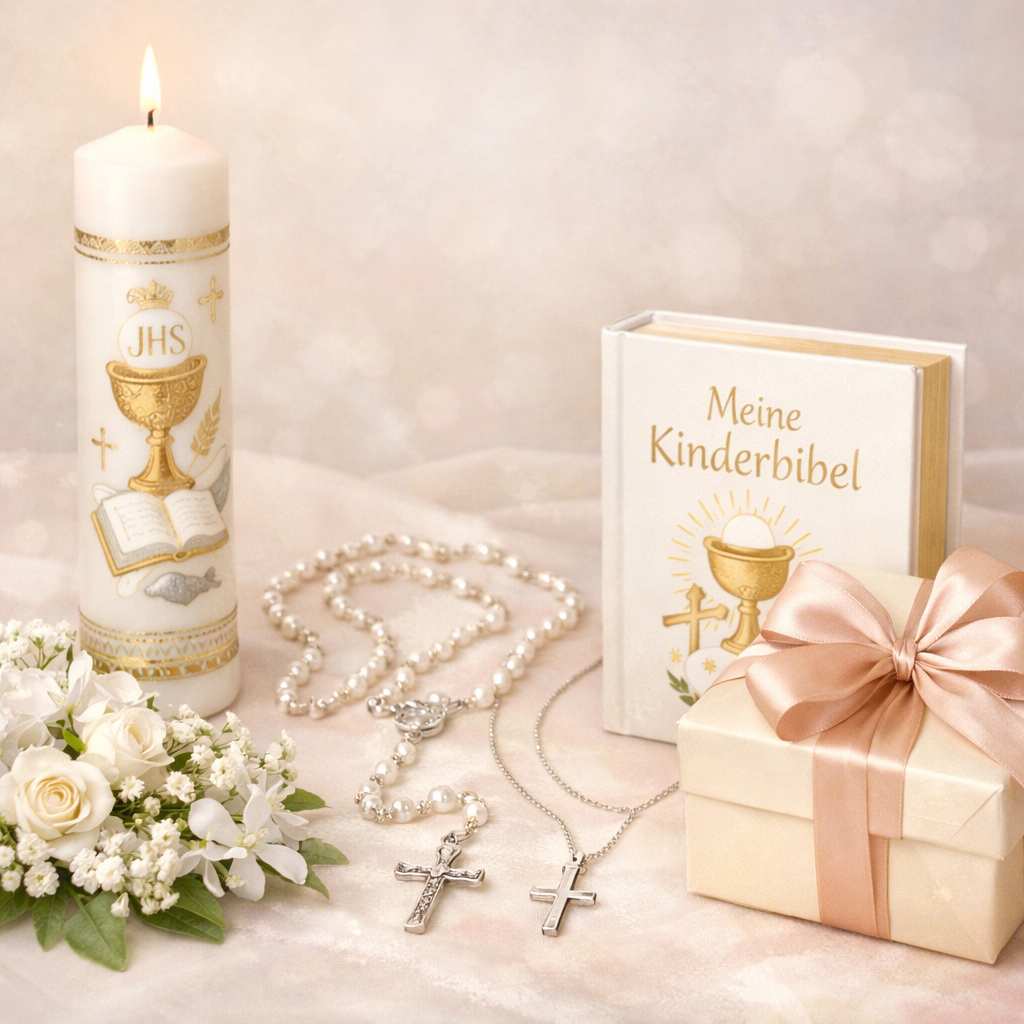 Spezielle Kinderbibeln oder Gebetsbücher mit kindgerechten Texten und Illustrationen sind sehr beliebte Geschenke. - Kommunionkerze:
