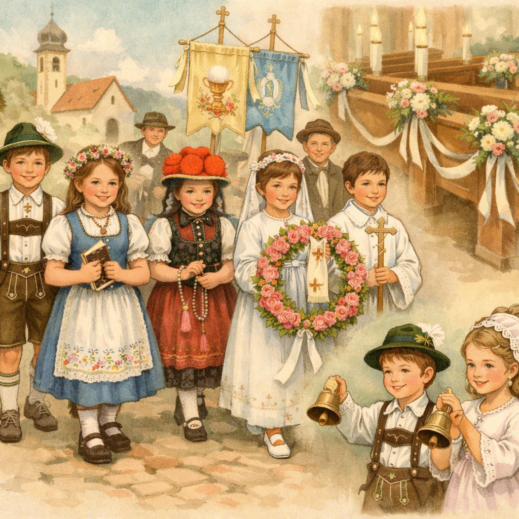 In vielen Teilen Bayerns und Österreichs tragen die Mädchen oft ein traditionelles weißes Kommunionkleid mit Spitzen und Schleier, während die Jungen ein festliches Sakko oder einen Anzug tragen. Mancherorts gibt es Prozessionen, bei denen die Kinder mit Blumen oder Blütenblättern den Kirchenweg schmücken. In manchen Regionen ist es üblich, dass die Kinder während der Messe ein spezielles Kommuniongebet sprechen oder kleine Rollen im Gottesdienst übernehmen. - Rheinland: