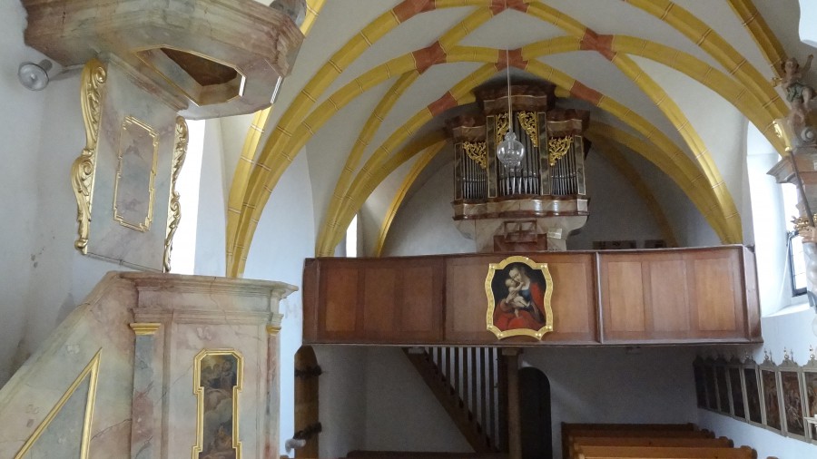 Betritt man den ehrwürdigen Sakralraum, empfängt den Besucher ein prachtvolles Netzrippengewölbe, das 1517 eingezogen wurde. Die zwei Rokkokoaltäre schuf wahrscheinlich um 1755 der Osterhofener Bildhauer Maximilian Wagner. Den Seitenaltar schmückt ein sehr wertvolles Sebastianibild. Schöpfer dieses Kleinods ist der aus Aicha a. Donau stammende Franz Anton Rauscher. Dies geht aus der auf der Rückseite des Tafelbildes angebrachten Inschrift hervor: „Franz Rauscher discipulus Aegidi Asam pinxit 1754, constat 36 fl.“ (Übersetzung etwa: Franz Rauscher, Schüler des Aegidius Asam, hat 1754 gemalt und erhält 36 Gulden). Auch die bereits erwähnte Votivtafel malte Franz Rauscher.