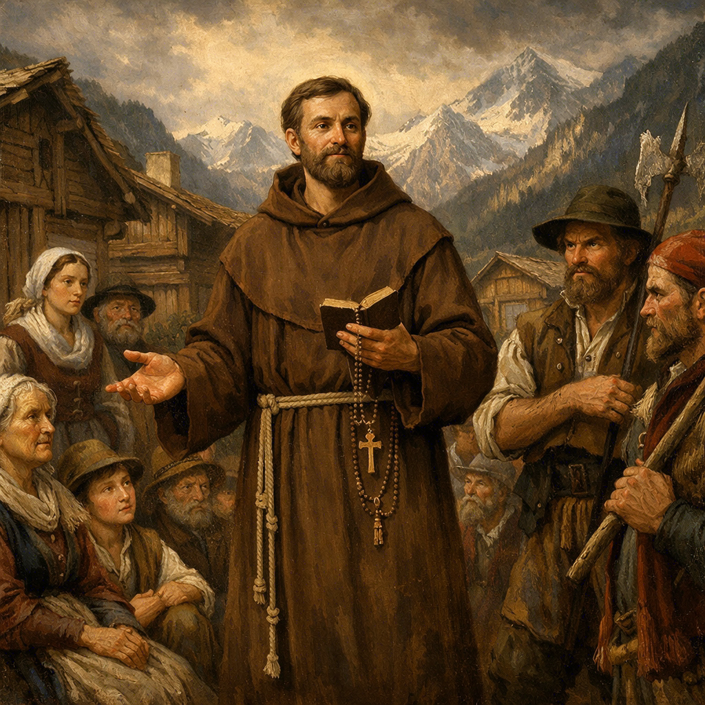 Fidelis (1578–1622) war ein Idealist mit einer großen Vision – und den falschen Verbündeten. Er wurde als Marcus Rey in Sigmaringen (heute Baden-Württemberg) geboren. Nach seinem Studium der Philosophie und Rechtswissenschaft begleitete Marcus den Freiherrn Wilhelm von Stotzingen auf Reisen durch ganz Europa. Später erhielt er eine Stelle am obersten Gerichtshof, wo er sich als „Anwalt der Armen“ einen Namen machte. Doch die um sich greifende Korruption stieß Marcus dermaßen ab, dass er sein Amt niederlegte. Er trat dem strengen Kapuzinerorden bei und nahm den Namen Fidelis an. Nach seiner Priesterweihe wurde er zur Mission in das reformierte Prättigau (heute Schweiz) gesandt. Kurz zuvor hatten österreichische Truppen im Zuge des Dreißigjährigen Krieges die Region erobert und versuchten nun, die Bevölkerung unter Zwang zu re-katholisieren. Fidelis lehnte Gewaltanwendung im Glauben ab und zog predigend durch die Dörfer. Er wollte die Menschen mit seinen Worten und seinem Vorbild überzeugen. Die Unterdrückten aber sahen in ihm einen Repräsentanten der Glaubensverfolgung: Reformierte Bauern lockten ihn am 24. April 1622 in einen Hinterhalt und töteten ihn durch zahlreiche Hiebe und Stiche. Papst Benedikt XIV. sprach ihn 1746 heilig.