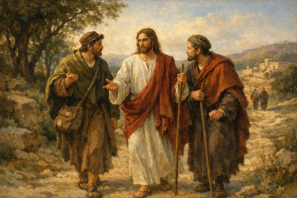Ostermontag: Die beiden Jünger begegnen auf dem Weg nach Emmaus dem auferstandenen Jesus, erkennen ihn aber zunächst nicht, obwohl er ihnen die Schrift auslegt.
