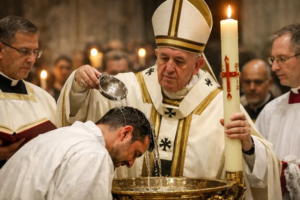 Papst Franziskus tauft in der Osternacht einen erwachsenen Gläubigen.