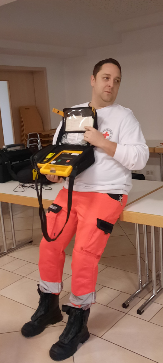 Für den zweiten Teil des Nachmittags konnte. W. Klinger Herrn Florian Brumm begrüßen, der sich bereit erklärte, die Handhabung eines Defibrillators zu demonstrieren. Dabei erläuterte er die einzelnen Schritte, die vom Gerät mehr oder weniger mitgeteilt werden. Es stellte sich dabei heraus, dass aber die wichtigste Maßnahme bei einem Herzinfarkt als allererstes der Notruf 112 ist und dann sollte man mit den einzelnen Schritten beginnen. Die anwesenden Zuhörer waren von den Ausführungen sehr beeindruckt. In diesem Zusammenhang wies er auch noch auf die Wichtigkeit der Patientenverfügung, die jeder schriftlich machen sollte. Am Ende seiner Vorführung musste er noch eine Reihe von Fragen der anwesenden Besucher beantworten.